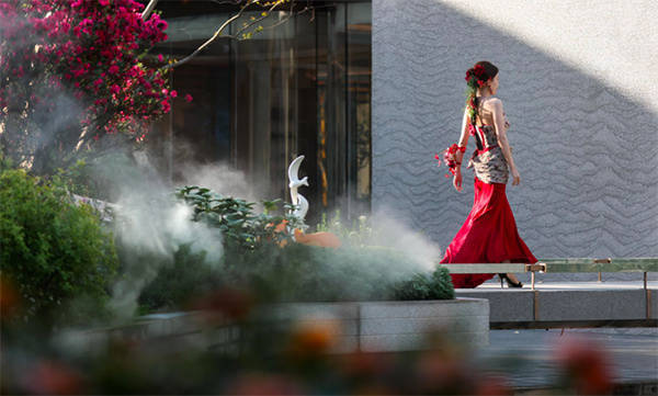 在美学示范区入口处,延展出一条长约80米的迎宾仪式轴线,酒店式归家前场采用“夏布”所特有的柔美弧线设计,由白玫瑰、潘多拉大理石等石材构筑而成的水景相映成趣。