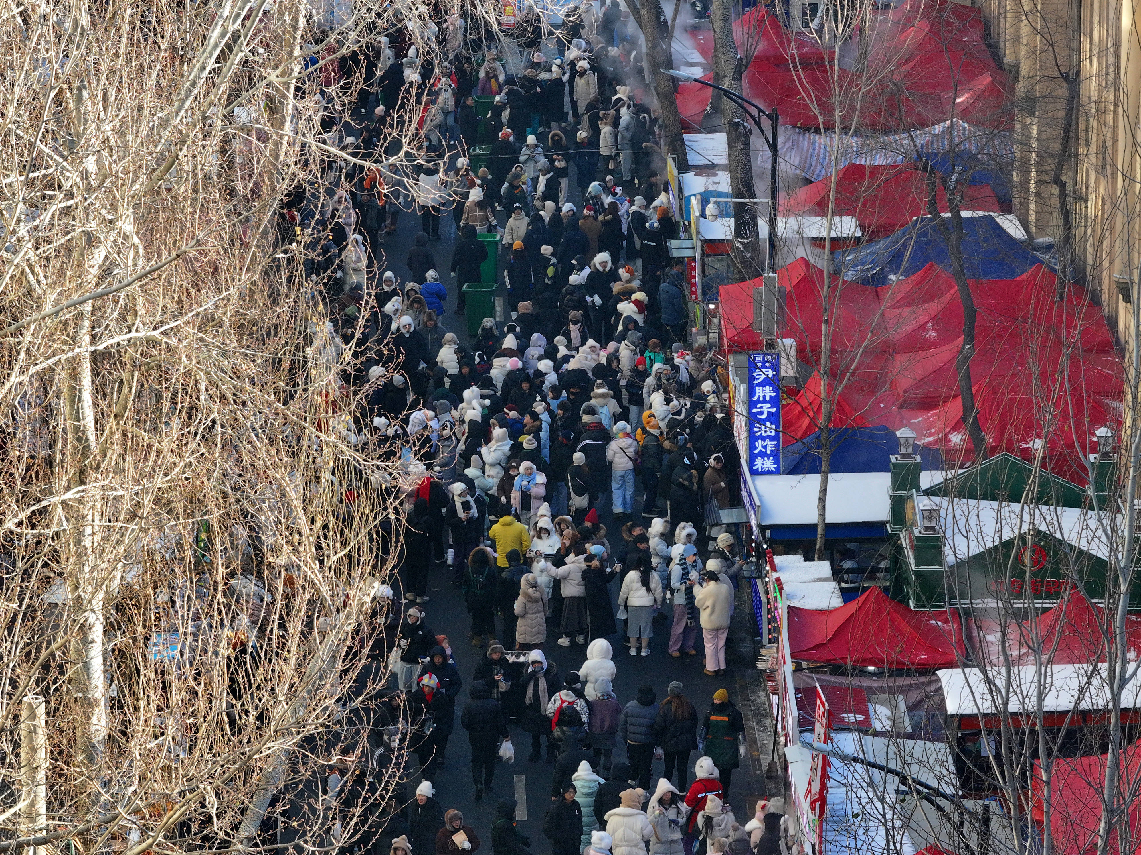 1月14日,哈尔滨市道里区红专街早市人流熙攘(无人机照片)。新华社发(张树 摄)“现做现吃的牛肉火勺,5元5个、10元11个……”小河沿早市的一家火勺摊位前,排起长长的队伍。翻滚的热油中,一个个牛肉火勺泛出金黄色泽,快速翻面之后,面皮的焦香和内馅的肉香扑鼻而来。伴随着吆喝声,热气腾腾的火勺出炉了,摊主一手撑着食品袋,一手用夹子往里夹,“孩子,我再送你两个!”